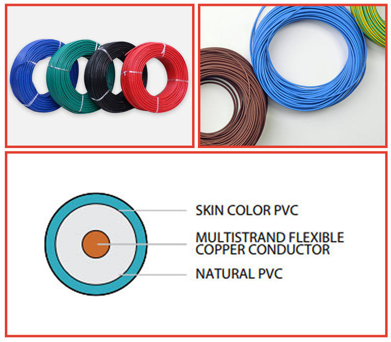 Fine stranded conductor of annealed tinned copper wire bunched together, insulation of special FR-PVC compound of insulation resistance >100M Ohms/Km. Colours available as colour code Table No. 02